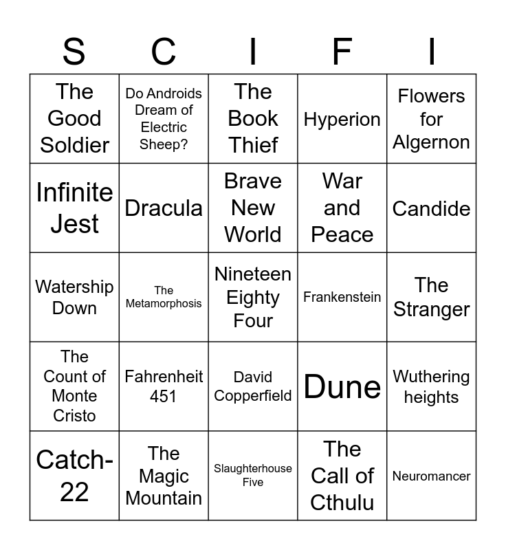 This bingo card has a free space and 24 words: Fahrenheit 451, The Magic Mountain, Brave New World, Catch-22, Flowers for Algernon, The Good Soldier, Infinite Jest, Do Androids Dream of Electric Sheep?, Frankenstein, David Copperfield, War and Peace, Watership Down, Dune, Wuthering heights, Dracula, The Call of Cthulu, The Stranger, The Book Thief, Candide, The Metamorphosis, Neuromancer, The Count of Monte Cristo, Hyperion and Slaughterhouse Five.