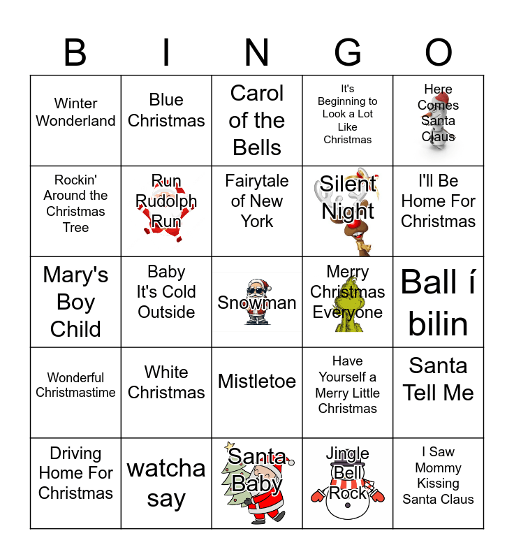 This bingo card has 7 images, a free space and 49 words: Last Christmas, I Saw Mommy Kissing Santa Claus, All I Want for Christmas is You, Santa Baby, White Christmas, Santa Claus is Coming to Town, Blue Christmas, Feliz Navidad, Rockin' Around the Christmas Tree, Happy Xmas (War is Over), Run Rudolph Run, It's Beginning to Look a Lot Like Christmas, Santa Tell Me, Have Yourself a Merry Little Christmas, Do They Know It's Christmas?, O Holy Night, Fairytale of New York, Merry Christmas Everyone, Let It Snow! Let It Snow! Let It Snow!, Here Comes Santa Claus, Baby It's Cold Outside, Jingle Bell Rock, Winter Wonderland, Silent Night, Joy To The World, I'll Be Home For Christmas, Driving Home For Christmas, Deck The Hall, Mistletoe, Wonderful Christmastime, Auld Lang Syne, who let the dogs out, candy shop, In da club, watcha say, frensurin hjá óla, renna nakin, Tú alfagra land mítt, Ball í bilin, á kantinum, Loyndarmál, Norðlýsið, Mr. Brightside, Numb, Mary's Boy Child, Carol of the Bells, It's the Most Wonderful Time of the Year, Rudolph the Red-Nosed Reindeer and Frosty the Snowman.