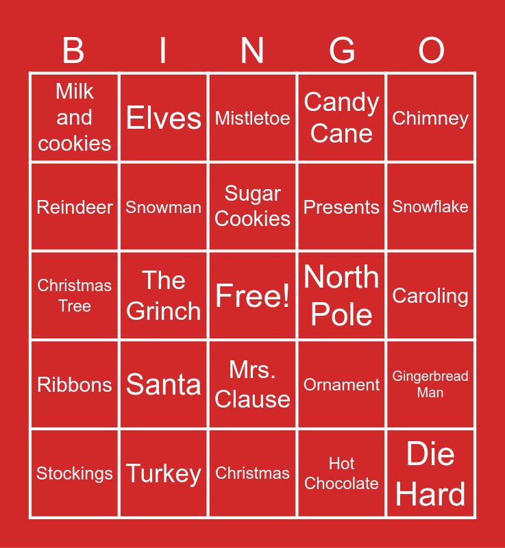 This bingo card has a free space and 25 words: Santa, Christmas, Sugar Cookies, Stockings, Chimney, Milk and cookies, Reindeer, Elves, North Pole, Mrs. Clause, Presents, Christmas Tree, Ornament, Gingerbread Man, Snowman, Sleigh, Caroling, Mistletoe, Snowflake, The Grinch, Die Hard, Turkey, Ribbons, Candy Cane and Hot Chocolate.