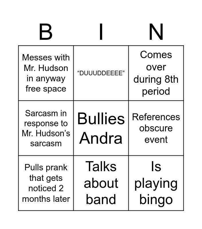 This bingo card has 9 words: Pulls prank that gets noticed 2 months later, Comes over during 8th period, “DUUUDDEEEE”, Sarcasm in response to Mr. Hudson’s sarcasm, Messes with Mr. Hudson in anyway free space, References obscure event, Bullies Andra, Is playing bingo and Talks about band.
