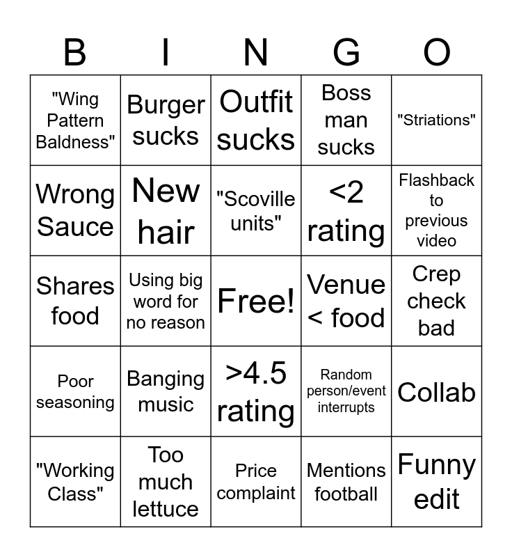 This bingo card has a free space and 25 words: Banging music, Price complaint, "Scoville units", "Working Class", "Striations", "Wing Pattern Baldness", Wrong Sauce, Burger sucks, Venue < food, >4.5 rating, <2 rating, Shares food, Random person/event interrupts, Collab, New hair, "Palette cleanser", Crep check bad, Outfit sucks, Flashback to previous video, Using big word for no reason, Funny edit, Too much lettuce, Poor seasoning, Boss man sucks and Mentions football.
