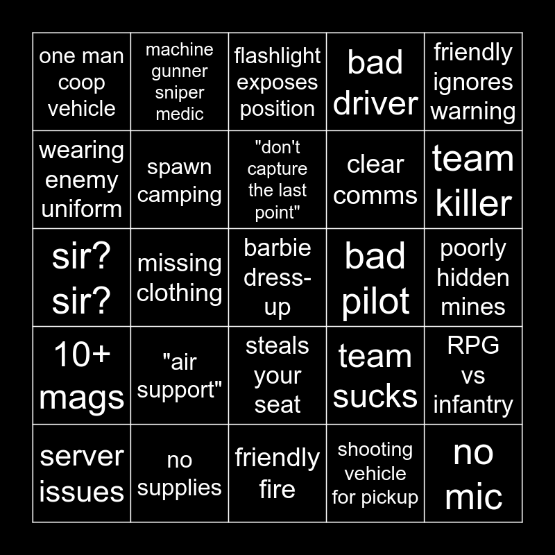 This bingo card has a free space and 28 words: RPG vs infantry, first build is arsenal, clear comms, shooting vehicle for pickup, wearing enemy uniform, flashlight exposes position, machine gunner sniper medic, 10+ mags, bad pilot, server issues, sir? sir?, bad driver, no supplies, friendly fire, team killer, great wall of china, "air support", spawn camping, "don't capture the last point", steals your seat, one man coop vehicle, pilot outfit on the frontlines, no mic, missing clothing, poorly hidden mines, team sucks, friendly ignores warning and prisoner / taken hostage.