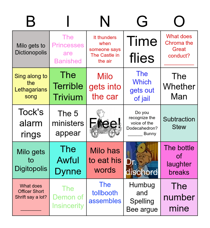 This bingo card has 1 images, a free space and 24 words: The Awful Dynne, The Demon of Insincerity, Milo gets into the car, What does Officer Short Shrift say a lot? ________, What does Chroma the Great conduct? __________, Milo gets to Dictionopolis, Sing along to the Lethagarians song, The Princesses are Banished, Do you recognize the voice of the Dodecahedron? ______ Bunny, Milo has to eat his words, The Which gets out of jail, Tock's alarm rings, Dr. dischord, The bottle of laughter breaks, The Terrible Trivium, Humbug and Spelling Bee argue, Subtraction Stew, It thunders when someone says The Castle in the air, The Whether Man, The 5 ministers appear, The number mine, Milo gets to Digitopolis, Time flies and The tollbooth assembles.