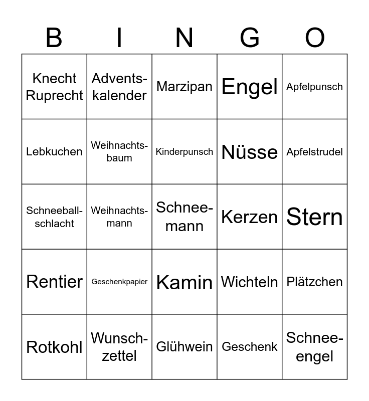 This bingo card has a free space and 49 words: Adventskranz, Schnee- engel, Frohe Weihnachten, Glühwein, Geschenkpapier, Weihnachts-markt, Advents-kalender, Lichterkette, Lebkuchen, Heiligabend, Weihnachts-baum, Engel, Plätzchen, Wichteln, Kartoffel-salat, Spekulatius, Kinderpunsch, Kerzen, Nikolaustag, Apfelpunsch, Weihnachts-mann, Geschenk, Knecht Ruprecht, Nüsse, Ente, Apfelstrudel, Rotkohl, Eiszapfen, Kamin, Rentier, Rentier- schlitten, Stiefel, Schnee, Kirche, Wunsch-zettel, Schlitten, Winter, Dezember, Stern, Lebkuchen- haus, Winterjacke, Rudolph, Schokolade, Sauerkraut, Schneeball- schlacht, Marzipan, Heiße Schoko- lade, Bratkartoffeln and Würstchen.