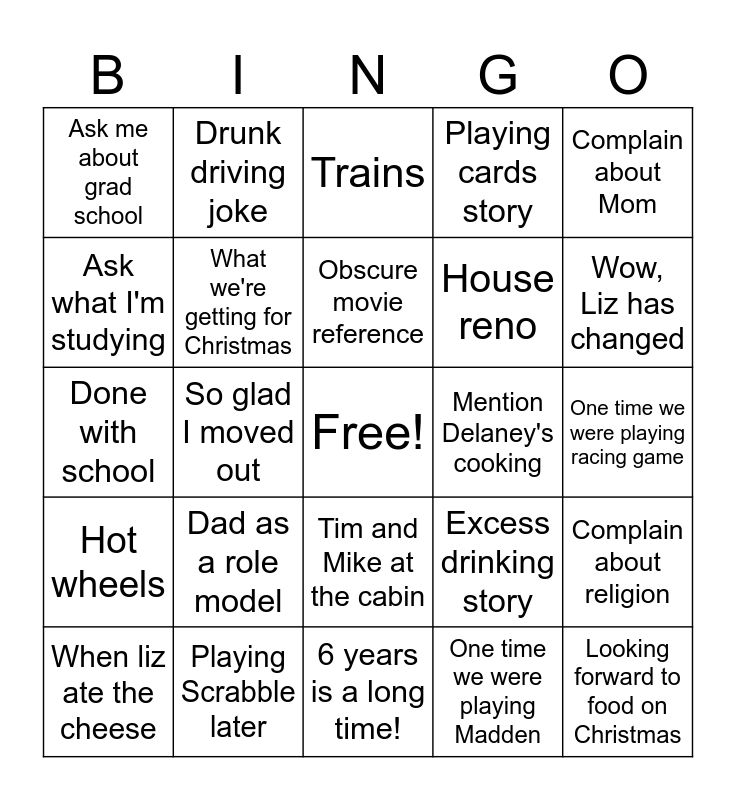 This bingo card has a free space and 24 words: Dad as a role model, Playing Scrabble later, Obscure movie reference, When liz ate the cheese, Complain about Mom, Ask me about grad school, Ask what I'm studying, Drunk driving joke, Mention Delaney's cooking, Tim and Mike at the cabin, House reno, Done with school, Excess drinking story, Complain about religion, What we're getting for Christmas, One time we were playing Madden, One time we were playing racing game, Trains, Wow, Liz has changed, So glad I moved out, Looking forward to food on Christmas, Hot wheels, Playing cards story and 6 years is a long time!.