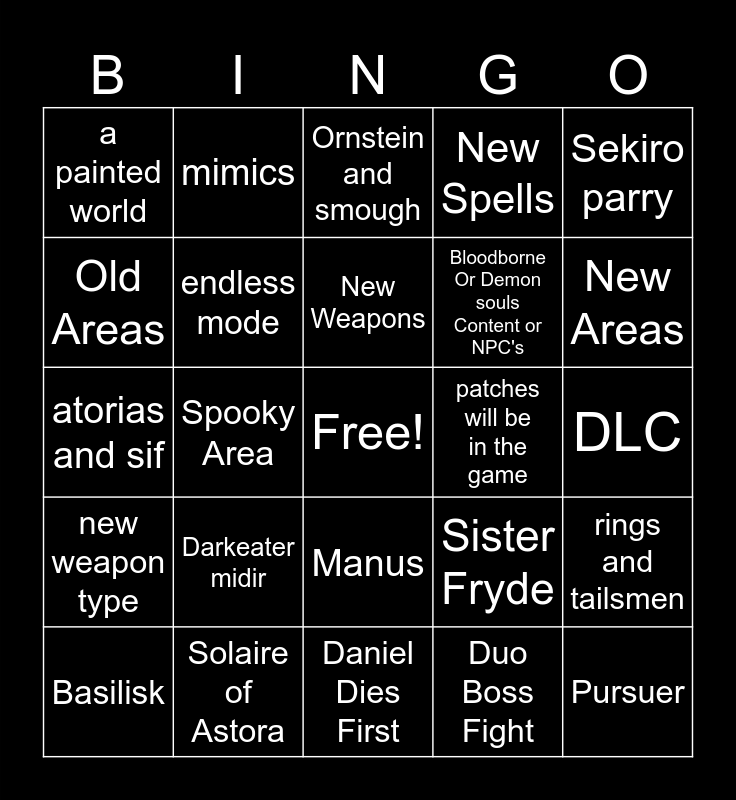 This bingo card has a free space and 24 words: Darkeater midir, Solaire of Astora, New Weapons, Basilisk, Sekiro parry, a painted world, Old Areas, mimics, patches will be in the game, Manus, Bloodborne Or Demon souls Content or NPC's, atorias and sif, Sister Fryde, rings and tailsmen, endless mode, Duo Boss Fight, DLC, Ornstein and smough, New Areas, Spooky Area, Pursuer, new weapon type, New Spells and Daniel Dies First.