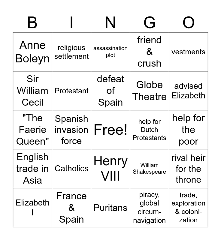 This bingo card has a free space and 24 words: Catholics, France & Spain, defeat of Spain, Elizabeth I, vestments, Anne Boleyn, Sir William Cecil, religious settlement, help for Dutch Protestants, Henry VIII, Globe Theatre, "The Faerie Queen", William Shakespeare, rival heir for the throne, Protestant, piracy, global circum-navigation, help for the poor, assassination plot, advised Elizabeth, Spanish invasion force, trade, exploration & coloni-zation, English trade in Asia, friend & crush and Puritans.