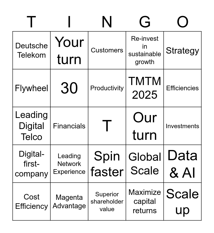 This bingo card has a free space and 24 words: Leading Network Experience, Magenta Advantage, Productivity, Cost Efficiency, Strategy, Deutsche Telekom, Flywheel, Your turn, Our turn, Spin faster, TMTM 2025, Leading Digital Telco, Global Scale, Data & AI, 30, Maximize capital returns, Investments, Customers, Efficiencies, Financials, Scale up, Digital-first-company, Re-invest in sustainable growth and Superior shareholder value.