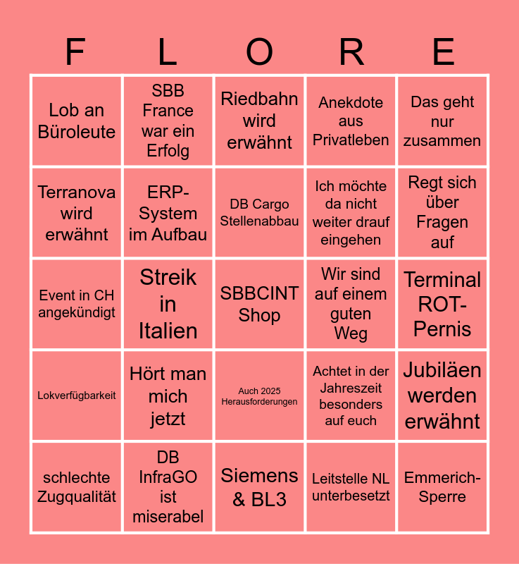This bingo card has a free space and 24 words: Hört man mich jetzt, DB InfraGO ist miserabel, DB Cargo Stellenabbau, schlechte Zugqualität, Das geht nur zusammen, Lob an Büroleute, Terranova wird erwähnt, SBB France war ein Erfolg, Wir sind auf einem guten Weg, Auch 2025 Herausforderungen, Ich möchte da nicht weiter drauf eingehen, Event in CH angekündigt, Achtet in der Jahreszeit besonders auf euch, Jubiläen werden erwähnt, ERP-System im Aufbau, Leitstelle NL unterbesetzt, Terminal ROT-Pernis, Riedbahn wird erwähnt, Regt sich über Fragen auf, Streik in Italien, Emmerich-Sperre, Lokverfügbarkeit, Anekdote aus Privatleben and Siemens & BL3.
