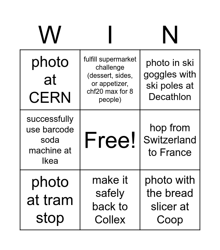 This bingo card has a free space and 8 words: hop from Switzerland to France, photo in ski goggles with ski poles at Decathlon, fulfill supermarket challenge (dessert, sides, or appetizer, chf20 max for 8 people), photo at tram stop, photo at CERN, photo with the bread slicer at Coop, successfully use barcode soda machine at Ikea and make it safely back to Collex.