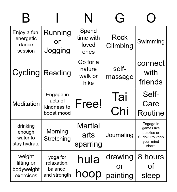 This bingo card has a free space and 24 words: Morning Stretching, yoga for relaxation, balance, and strength, Go for a nature walk or hike, weight lifting or bodyweight exercises, Swimming, Enjoy a fun, energetic dance session, Cycling, Running or Jogging, Tai Chi, Martial arts sparring, self-massage, Meditation, Journaling, Engage in games like puzzles or Sudoku to keep your mind sharp, Reading, drawing or painting, Self-Care Routine, Spend time with loved ones, connect with friends, Engage in acts of kindness to boost mood, 8 hours of sleep, drinking enough water to stay hydrate, Rock Climbing and hula hoop.