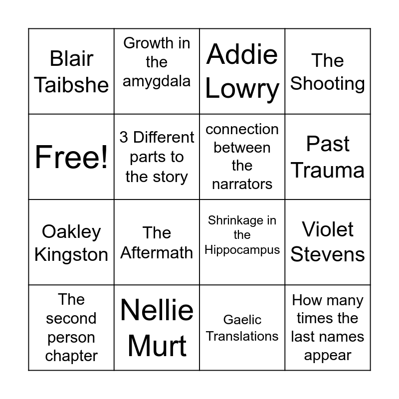 This bingo card has 16 words: Nellie Murt, Violet Stevens, Addie Lowry, Blair Taibshe, Oakley Kingston, Growth in the amygdala, Shrinkage in the Hippocampus, Gaelic Translations, Free!, 3 Different parts to the story, The second person chapter, The Shooting, The Aftermath, Past Trauma, connection between the narrators and How many times the last names appear.