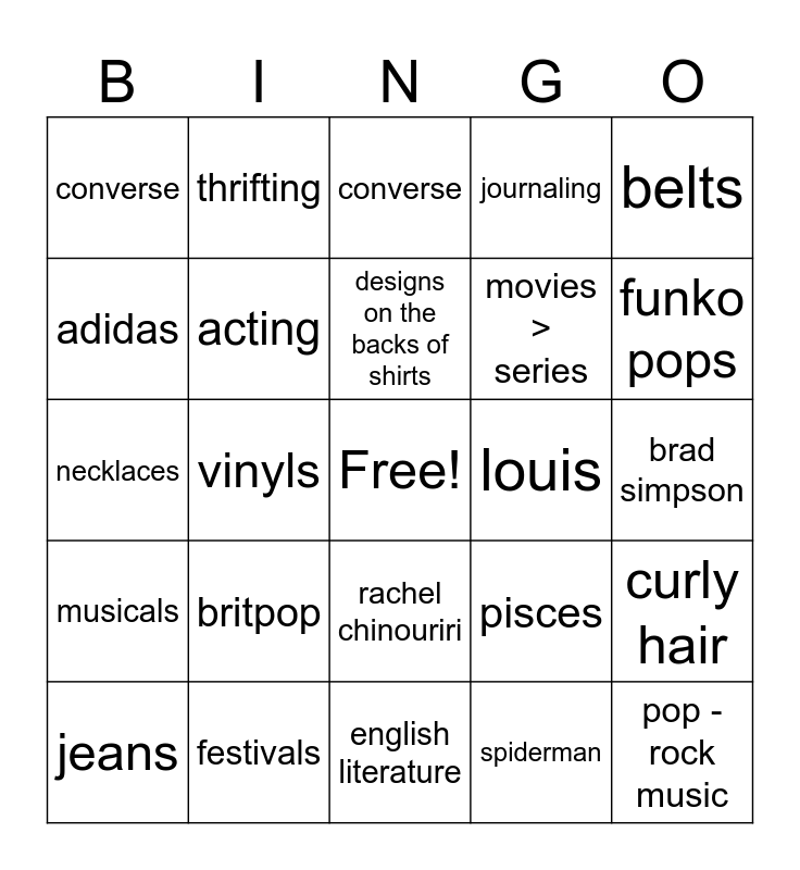 This bingo card has a free space and 24 words: britpop, festivals, designs on the backs of shirts, jeans, belts, converse, adidas, thrifting, louis, rachel chinouriri, movies > series, necklaces, pisces, curly hair, acting, spiderman, brad simpson, converse, funko pops, vinyls, pop -rock music, musicals, journaling and english literature.