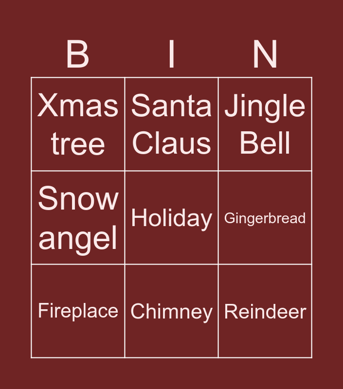 This bingo card has a free space and 8 words: Gingerbread, Jingle Bell, Santa Claus, Fireplace, Xmas tree, Reindeer, Snow angel and Chimney.