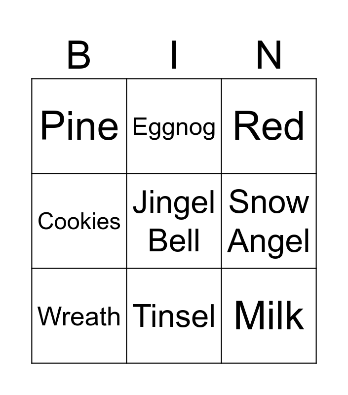 This bingo card has 9 words: Wreath, Red, Eggnog, Cookies, Pine, Snow Angel, Jingel Bell, Milk and Tinsel.