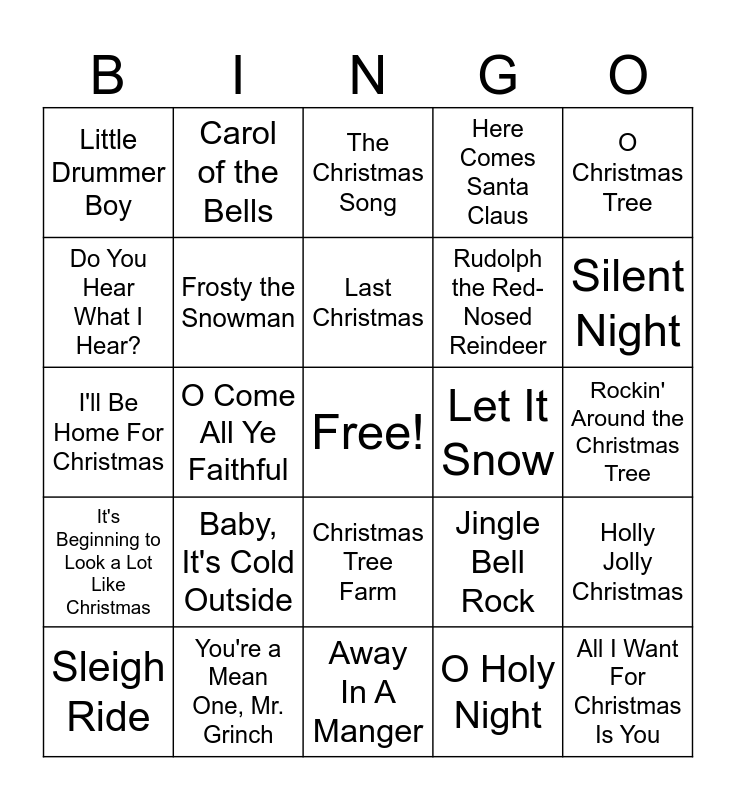 This bingo card has a free space and 51 words: 12 Days of Christmas, All I Want For Christmas Is You, Angels We Have Heard On High, Away In A Manger, Baby, It's Cold Outside, Blue Christmas, Carol of the Bells, Deck the Halls, Do You Hear What I Hear?, Feliz Navidad, Frosty the Snowman, Here Comes Santa Claus, Holly Jolly Christmas, Jingle Bell Rock, Jingle Bells, Joy to the World, Last Christmas, Let It Snow, Mary, Did You Know?, O Christmas Tree, O Come All Ye Faithful, O Holy Night, Little Drummer Boy, Rudolph the Red-Nosed Reindeer, Santa Baby, Santa Claus Is Coming to Town, Silent Night, Silver Bells, Sleigh Ride, The Christmas Song, The First Noel, We Three Kings, We Wish You a Merry Christmas, Where Are You Christmas?, White Christmas, You're a Mean One, Mr. Grinch, Mistletoe, My Only Wish, Santa Tell Me, Merry Christmas, Happy Holidays, Rockin' Around the Christmas Tree, It's Beginning to Look a Lot Like Christmas, Winter Wonderland, It's the Most Wonderful Time of the Year, Up on the Housetop, Must Be Santa, I'll Be Home For Christmas, Candy Cane Lane, Christmas Without You, Christmas Tree Farm and Underneath the Christmas Tree.