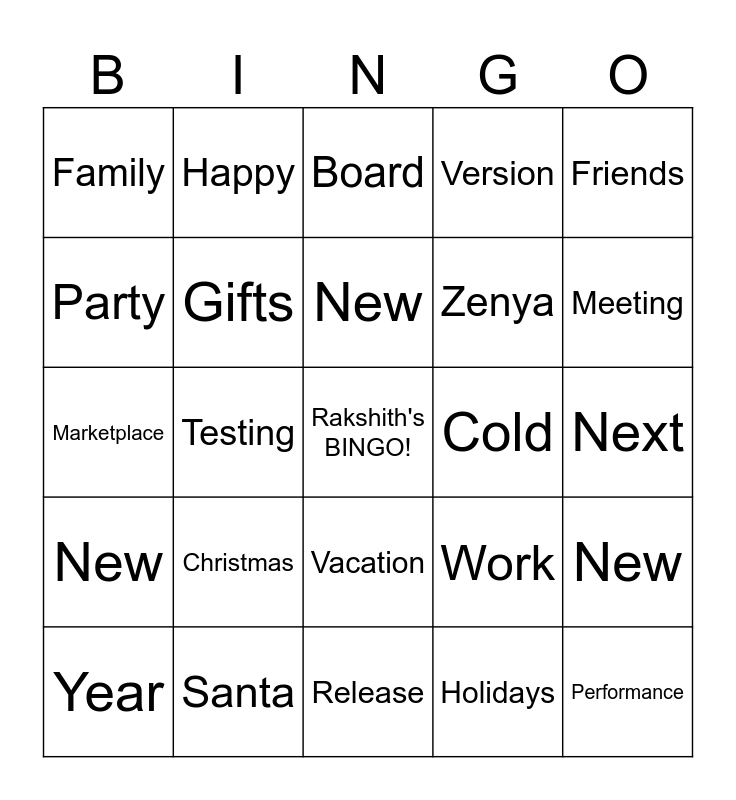 This bingo card has a free space and 24 words: Christmas, Santa, New, Year, Friends, Family, Party, Happy, Cold, Vacation, Zenya, Marketplace, Work, New, Gifts, Holidays, Next, Board, Meeting, Testing, Performance, New, Version and Release.