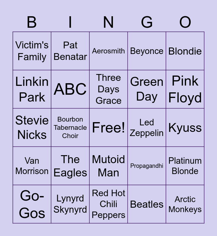 This bingo card has a free space and 34 words: Adèle, Beatles, Bob Seger, Hozier, Van Morrison, ABC, Blondie, Go-Gos, Pat Benatar, Queen, Three Days Grace, Aerosmith, Journey, Luke Combs, Led Zeppelin, Pink Floyd, Lynyrd Skynyrd, Stevie Nicks, The Eagles, Propagandhi, Mutoid Man, Nomeansno, Victim's Family, Kyuss, Red Hot Chili Peppers, Arctic Monkeys, Beyonce, Tame Impala, Green Day, Linkin Park, Leonard Cohen, Bourbon Tabernacle Choir, Platinum Blonde and Feist.