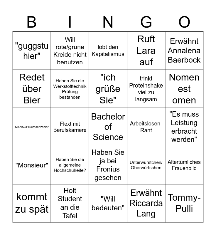 This bingo card has a free space and 24 words: Haben Sie die allgemeine Hochschulreife?, Holt Student an die Tafel, "ich grüße Sie", kommt zu spät, Erwähnt Annalena Baerbock, "guggstu hier", Redet über Bier, Will rote/grüne Kreide nicht benutzen, Arbeitslosen-Rant, Haben Sie ja bei Fronius gesehen, trinkt Proteinshake viel zu langsam, MANAGER/erbsenzähler, Unterwürstchen/ Oberwürtschen, Altertümliches Frauenbild, Haben Sie die Werkstofftechnik Prüfung bestanden, Erwähnt Riccarda Lang, "Es muss Leistung erbracht werden", lobt den Kapitalismus, Nomen est omen, Flext mit Berufskarriere, Tommy-Pulli, "Monsieur", Ruft Lara auf and "Will bedeuten".