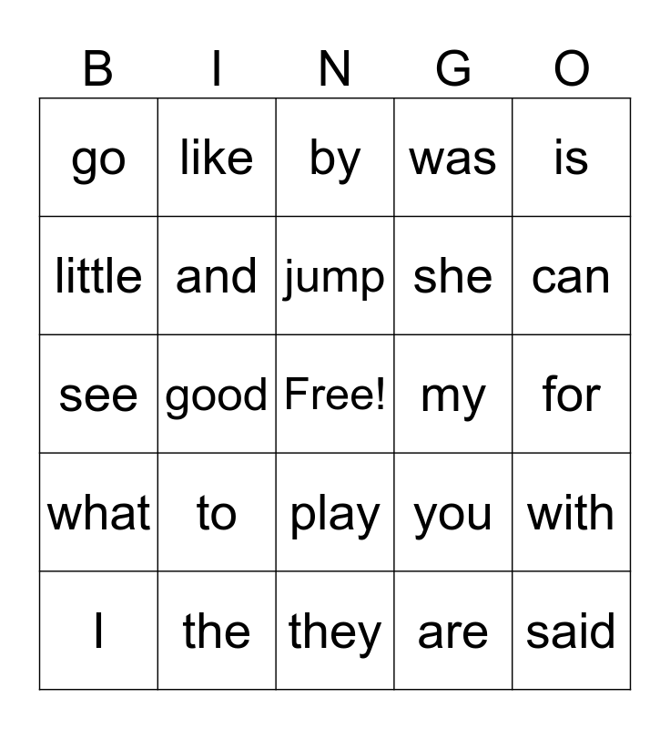 This bingo card has a free space and 24 words: to, the, jump, I, is, go, little, like, my, play, she, see, you, with, and, are, for, by, can, good, said, what, was and they.