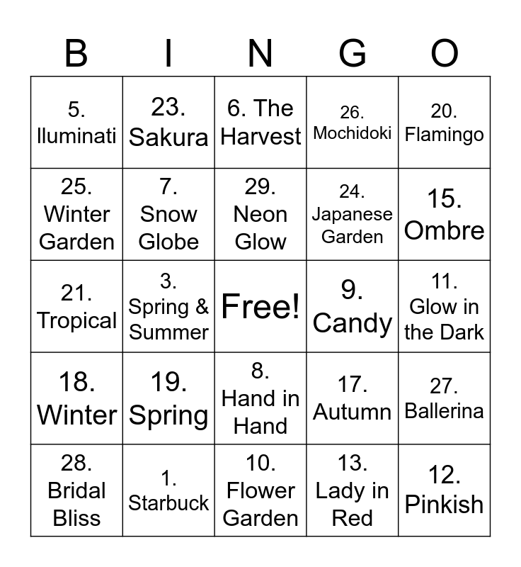This bingo card has a free space and 30 words: 1. Starbuck, 2. Glitter, 3. Spring & Summer, 4. Pastel, 5. lluminati, 6. The Harvest, 7. Snow Globe, 8. Hand in Hand, 9. Candy, 10. Flower Garden, 11. Glow in the Dark, 12. Pinkish, 13. Lady in Red, 14. Self Image, 15. Ombre, 16. Classic, 17. Autumn, 18. Winter, 19. Spring, 20. Flamingo, 21. Tropical, 22. Gel Remover, 23. Sakura, 24. Japanese Garden, 25. Winter Garden, 26. Mochidoki, 27. Ballerina, 28. Bridal Bliss, 29. Neon Glow and 30. French Kit.