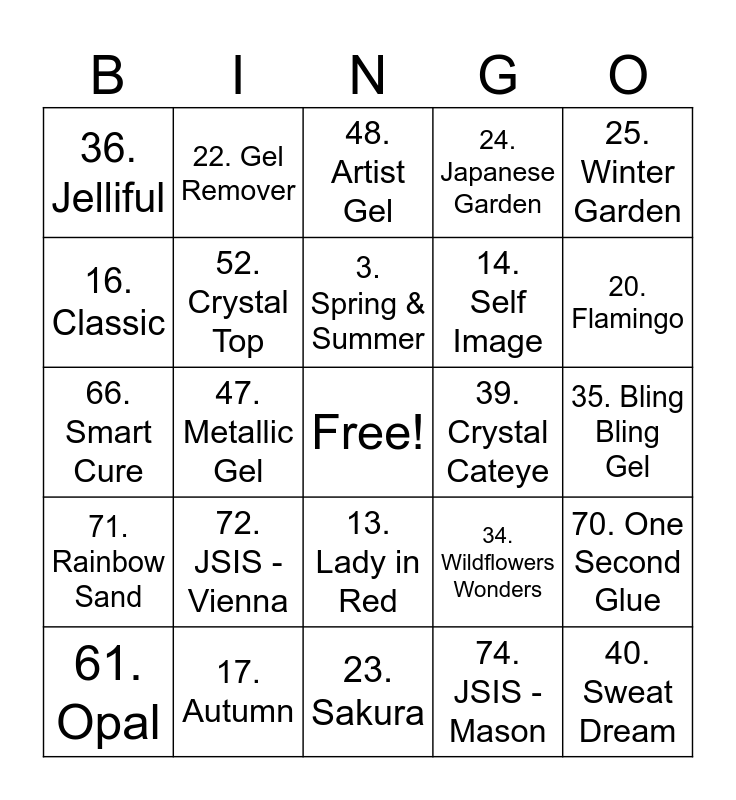 This bingo card has a free space and 75 words: 1. Starbuck, 2. Glitter, 3. Spring & Summer, 4. Pastel, 5. lluminati, 6. The Harvest, 7. Snow Globe, 8. Hand in Hand, 9. Candy, 10. Flower Garden, 11. Glow in the Dark, 12. Pinkish, 13. Lady in Red, 14. Self Image, 15. Ombre, 16. Classic, 17. Autumn, 18. Winter, 19. Spring, 20. Flamingo, 21. Tropical, 22. Gel Remover, 23. Sakura, 24. Japanese Garden, 25. Winter Garden, 26. Mochidoki, 27. Ballerina, 28. Bridal Bliss, 29. Neon Glow, 30. French Kit, 31. Line art Gel, 32. Cotton, 33. Bare Essentials, 34. Wildflowers Wonders, 35. Bling Bling Gel, 36. Jelliful, 37. Earthy Aura, 38. My Mood, 39. Crystal Cateye, 40. Sweat Dream, 41. DA collection, 42. Graffiti Ink, 43. Harmony, 44. Sterlyng Metal, 45. New Cateye, 46. 4Dip, 47. Metallic Gel, 48. Artist Gel, 49. Diamond Dust, 50. Crystal Clear, 51. Natural Pink, 52. Crystal Top, 53. Crystal Base, 54. zPrimer, 55. zChrome, 56. Sandy Shine, 57. Black Sand, 58. Fairy Tail, 59. Bewitched, 60. Galaxy, 61. Opal, 62. Sugar Glitter, 63. Angle Glitter, 64. Marble Ink, 65. zFile, 66. Smart Cure, 67. Neon Stain, 68. Holo Dust, 69. ManiTowel, 70. One Second Glue, 71. Rainbow Sand, 72. JSIS - Vienna, 73. JSIS - Demi Oliver, 74. JSIS - Mason and 75. zNipper.