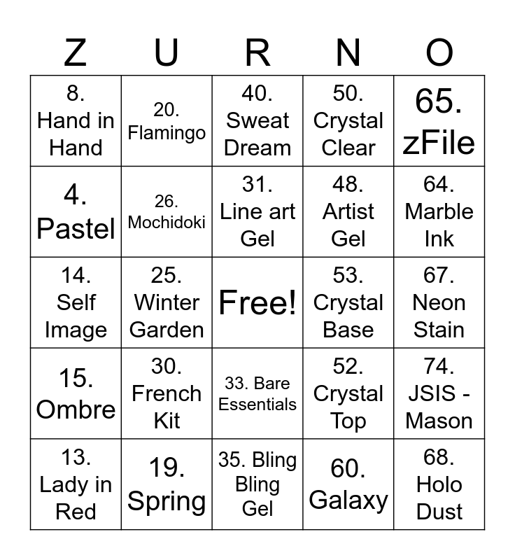 This bingo card has a free space and 75 words: 1. Starbuck, 16. Classic, 31. Line art Gel, 46. 4Dip, 61. Opal, 2. Glitter, 17. Autumn, 32. Cotton, 47. Metallic Gel, 62. Sugar Glitter, 3. Spring & Summer, 18. Winter, 33. Bare Essentials, 48. Artist Gel, 63. Angle Glitter, 4. Pastel, 19. Spring, 34. Wildflowers Wonders, 49. Diamond Dust, 64. Marble Ink, 5. lluminati, 20. Flamingo, 35. Bling Bling Gel, 50. Crystal Clear, 65. zFile, 6. The Harvest, 21. Tropical, 36. Jelliful, 51. Natural Pink, 66. Smart Cure, 7. Snow Globe, 22. Gel Remover, 37. Earthy Aura, 52. Crystal Top, 67. Neon Stain, 8. Hand in Hand, 23. Sakura, 38. My Mood, 53. Crystal Base, 68. Holo Dust, 9. Candy, 24. Japanese Garden, 39. Crystal Cateye, 54. zPrimer, 69. ManiTowel, 10. Flower Garden, 25. Winter Garden, 40. Sweat Dream, 55. zChrome, 70. One Second Glue, 11. Glow in the Dark, 26. Mochidoki, 41. DA collection, 56. Sandy Shine, 71. Rainbow Sand, 12. Pinkish, 27. Ballerina, 42. Graffiti Ink, 57. Black Sand, 72. JSIS - Vienna, 13. Lady in Red, 28. Bridal Bliss, 43. Harmony, 58. Fairy Tail, 73. JSIS - Demi Oliver, 14. Self Image, 29. Neon Glow, 44. Sterlyng Metal, 59. Bewitched, 74. JSIS - Mason, 15. Ombre, 30. French Kit, 45. New Cateye, 60. Galaxy and 75. zNipper.