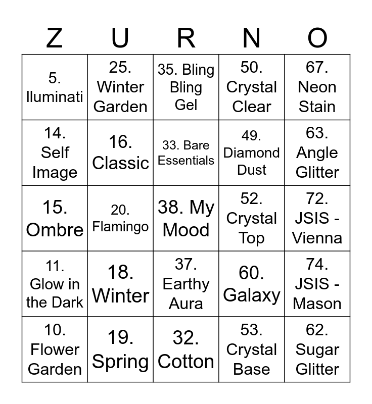 This bingo card has 76 words: Free!, 1. Starbuck, 16. Classic, 31. Line art Gel, 46. 4Dip, 61. Opal, 2. Glitter, 17. Autumn, 32. Cotton, 47. Metallic Gel, 62. Sugar Glitter, 3. Spring & Summer, 18. Winter, 33. Bare Essentials, 48. Artist Gel, 63. Angle Glitter, 4. Pastel, 19. Spring, 34. Wildflowers Wonders, 49. Diamond Dust, 64. Marble Ink, 5. lluminati, 20. Flamingo, 35. Bling Bling Gel, 50. Crystal Clear, 65. zFile, 6. The Harvest, 21. Tropical, 36. Jelliful, 51. Natural Pink, 66. Smart Cure, 7. Snow Globe, 22. Gel Remover, 37. Earthy Aura, 52. Crystal Top, 67. Neon Stain, 8. Hand in Hand, 23. Sakura, 38. My Mood, 53. Crystal Base, 68. Holo Dust, 9. Candy, 24. Japanese Garden, 39. Crystal Cateye, 54. zPrimer, 69. ManiTowel, 10. Flower Garden, 25. Winter Garden, 40. Sweat Dream, 55. zChrome, 70. One Second Glue, 11. Glow in the Dark, 26. Mochidoki, 41. DA collection, 56. Sandy Shine, 71. Rainbow Sand, 12. Pinkish, 27. Ballerina, 42. Graffiti Ink, 57. Black Sand, 72. JSIS - Vienna, 13. Lady in Red, 28. Bridal Bliss, 43. Harmony, 58. Fairy Tail, 73. JSIS - Demi Oliver, 14. Self Image, 29. Neon Glow, 44. Sterlyng Metal, 59. Bewitched, 74. JSIS - Mason, 15. Ombre, 30. French Kit, 45. New Cateye, 60. Galaxy and 75. zNipper.