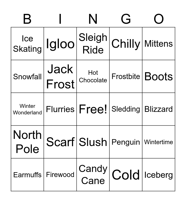 This bingo card has a free space and 38 words: Snowball, Snowflake, Snowman, Jack Frost, Wintertime, Scarf, Hot Chocolate, Fireplace, Mittens, Frostbite, Flurries, Chilly, Iceberg, Blizzard, Snowfall, North Pole, Sled, Sleigh Ride, Skiing, Sledding, Ice Skating, Firewood, Boots, Earmuffs, Frost, Candy Cane, Pinecone, Bobsled, White, Hail, Snow Shovel, Slush, Cold, Igloo, Polar Bear, Penguin, Winter Wonderland and frigid.