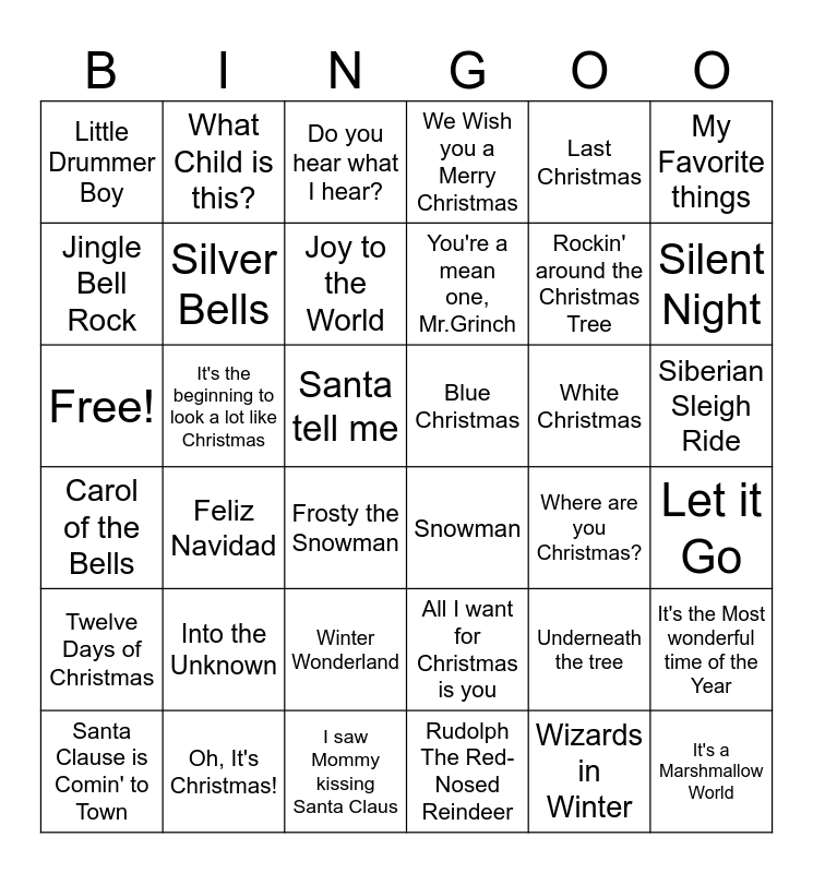 This bingo card has 36 words: All I want for Christmas is you, Winter Wonderland, Rudolph The Red-Nosed Reindeer, Jingle Bell Rock, Carol of the Bells, Blue Christmas, Silver Bells, I saw Mommy kissing Santa Claus, Last Christmas, Underneath the tree, Silent Night, We Wish you a Merry Christmas, It's the Most wonderful time of the Year, It's the beginning to look a lot like Christmas, You're a mean one, Mr.Grinch, Little Drummer Boy, Twelve Days of Christmas, White Christmas, Free!, Do you hear what I hear?, Santa tell me, Feliz Navidad, Snowman, Frosty the Snowman, Where are you Christmas?, What Child is this?, Rockin' around the Christmas Tree, Oh, It's Christmas!, Joy to the World, My Favorite things, It's a Marshmallow World, Santa Clause is Comin' to Town, Let it Go, Siberian Sleigh Ride, Into the Unknown and Wizards in Winter.