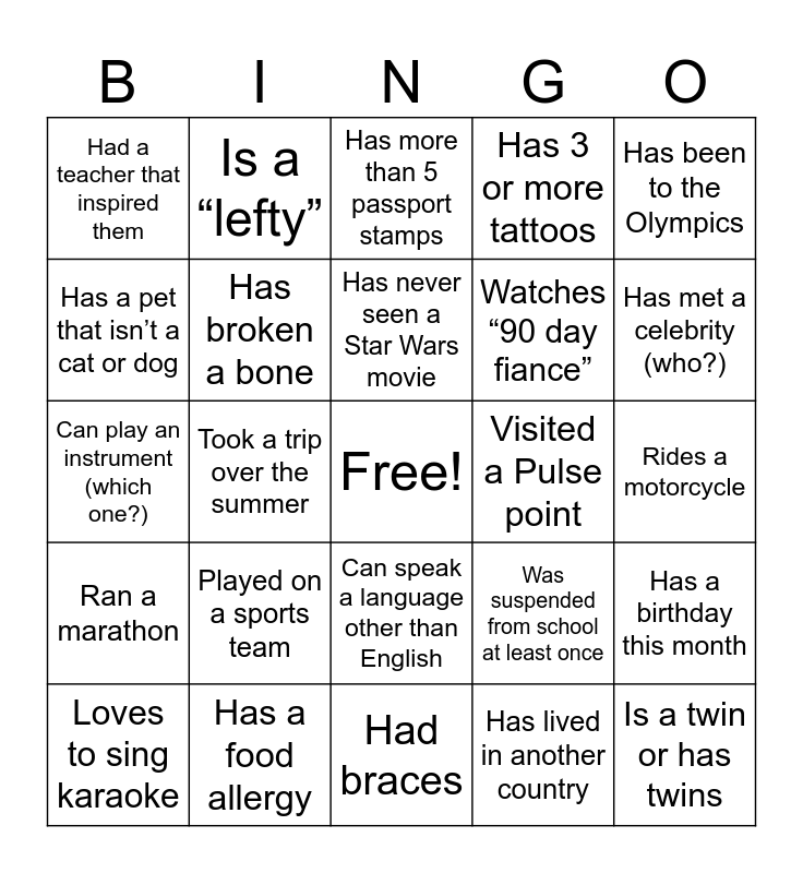This bingo card has a free space and 28 words: Has a birthday this month, Is an only child, Watches “90 day fiance”, Has lived in another country, Has a pet that isn’t a cat or dog, Has more than 5 passport stamps, Is a “lefty”, Ran a marathon, Visited a Pulse point, Loves to sing karaoke, Can play an instrument (which one?), Has 3 or more tattoos, Has a food allergy, Had braces, Has met a celebrity (who?), Made a New Year’s resolution and kept it, Played on a sports team, Has broken a bone, Has never seen a Star Wars movie, Can speak a language other than English, Had a teacher that inspired them, Received an Impact Reward, Is a twin or has twins, Took a trip over the summer, Rides a motorcycle, Was suspended from school at least once, Has been to the Olympics and Read 10 or more books this year.