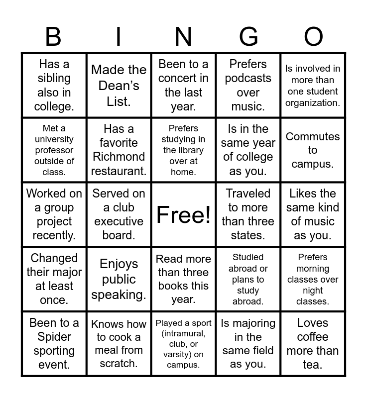 This bingo card has a free space and 35 words: Attended a university theater or arts performance., Joined a new organization this semester., Is from a different state than you., Has a favorite Richmond restaurant., Read more than three books this year., Prefers podcasts over music., Met a university professor outside of class., Participated in a campus tradition or event., Prefers studying in the library over at home., Holds a leadership position in an organization., Worked on a group project recently., Is involved in more than one student organization., Attended a leadership workshop before., Hosted an event on campus., Has a sibling also in college., Traveled to more than three states., Is majoring in the same field as you., Served on a club executive board., Changed their major at least once., Loves coffee more than tea., Studied abroad or plans to study abroad., Been to a Spider sporting event., Prefers morning classes over night classes., Knows how to cook a meal from scratch., Been to a concert in the last year., Commutes to campus., Is passionate about sustainability., Volunteered in the Richmond community., Is in the same year of college as you., Likes the same kind of music as you., Has a unique or interesting talent., Played a sport (intramural, club, or varsity) on campus., Enjoys public speaking., Made the Dean’s List. and Stayed on campus during a holiday break..
