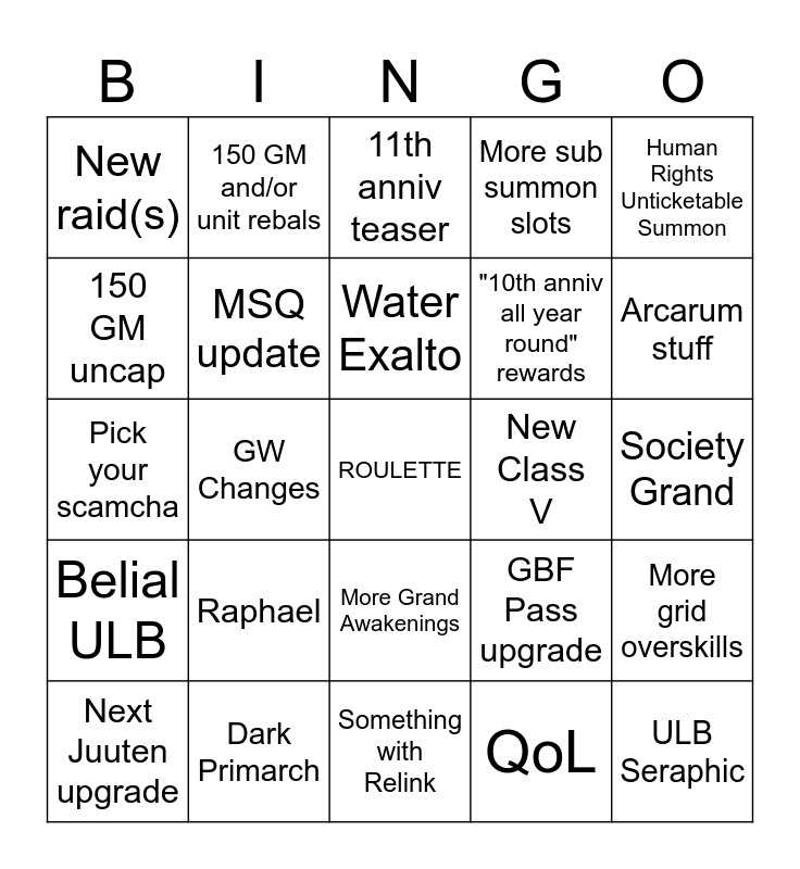 This bingo card has a free space and 24 words: Raphael, Dark Primarch, Water Exalto, Next Juuten upgrade, Human Rights Unticketable Summon, New raid(s), 150 GM uncap, 150 GM and/or unit rebals, New Class V, More Grand Awakenings, "10th anniv all year round" rewards, Pick your scamcha, GBF Pass upgrade, More grid overskills, MSQ update, QoL, Society Grand, 11th anniv teaser, Arcarum stuff, GW Changes, ULB Seraphic, Belial ULB, More sub summon slots and Something with Relink.