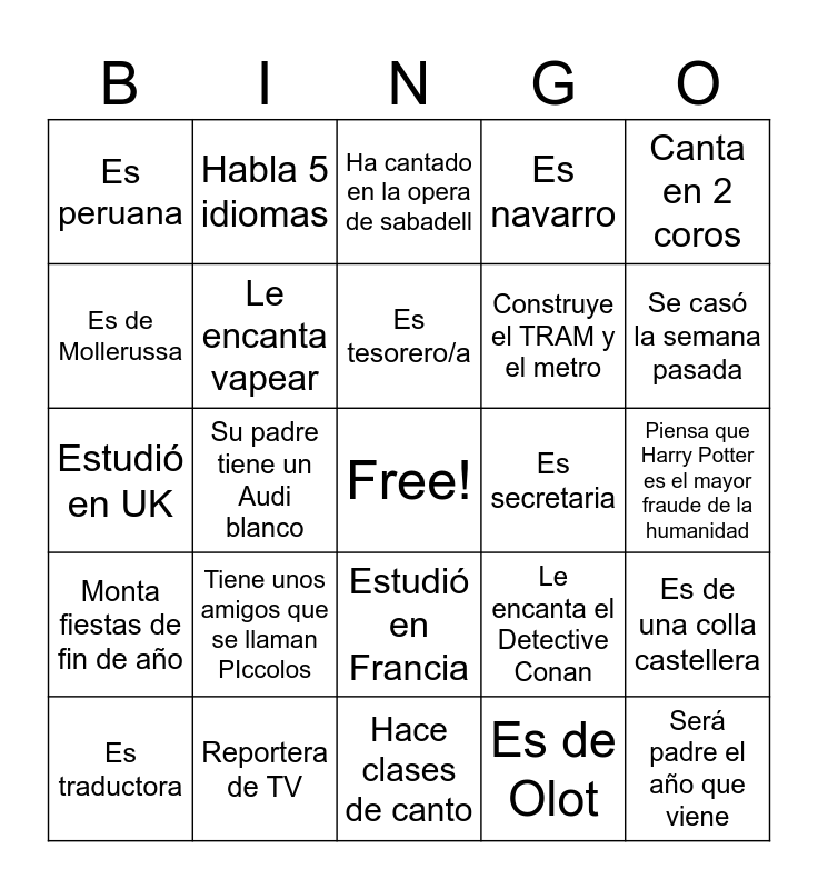 This bingo card has a free space and 60 words: Ha acampado en un volcán, Reportera de TV, Abogada de extranjería, Monta fiestas de fin de año, Es de Olot, Su hobby son los festivales, Le encanta vapear, Su hobby son las inversiones, Construye el TRAM y el metro, Su mascota es Harry Potter, Es navarro, Trabajó en abacus, Es de Mollerussa, Abogada derecho inmobiliario, Su lugar favorito es Tenerife, Es peruana, Será padre el año que viene, Canta en 2 coros, Trabaja en un laboratorio, Es tesorero/a, Es secretaria, Ha cantado en la opera de sabadell, Es traductora, Es de una colla castellera, Es italiano, Es chilena, Vivió en Canadá, Experto en auditoría fiscal, Se casó la semana pasada, Su familia tiene los restaurantes Chivuo's, Vivió en California, Tiene una perra que se llama Koda, Qué significa Ketubara, Es extremeña, Habla 5 idiomas, Inspectora de hacienda, Su cliente es una empresa de recogida de residuos, Su padre tiene un Audi blanco, Monta casas rurales, Estudió en UK, Querría ser el Emperador de Star Wars, Tiene unos amigos que se llaman PIccolos, Piensa que Harry Potter es el mayor fraude de la humanidad, Tiene un lego de Zelda, Le encanta el Detective Conan, Le encanta el Karaoke (no es del coro), Habla francés, Tiene una gata, Hace crossfit, Estudió en Francia, Hace clases de canto, Trabajó en Five Guys, Es venezolana, Es francés, Es portuguesa, Está en la Ketu Escola, Es brasileño, Tiene el título para llevar barco, Querría ser Gengis Khan and Estudió en Francia.