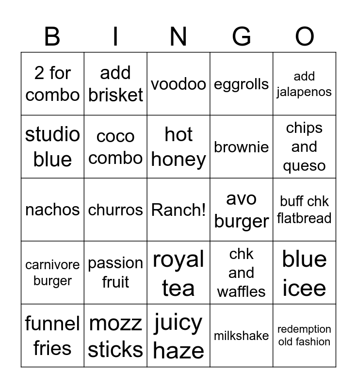 This bingo card has a free space and 24 words: passion fruit, mozz sticks, hot honey, funnel fries, add jalapenos, 2 for combo, studio blue, add brisket, avo burger, royal tea, brownie, nachos, chk and waffles, blue icee, coco combo, milkshake, buff chk flatbread, voodoo, chips and queso, churros, redemption old fashion, carnivore burger, eggrolls and juicy haze.
