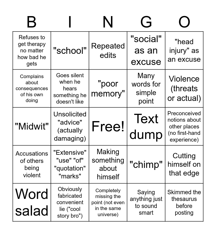 This bingo card has a free space and 24 words: "Extensive" "use" "of" "quotation" "marks", Obviously fabricated convenient lie ("cool story bro"), "poor memory", Word salad, "head injury" as an excuse, Refuses to get therapy no matter how bad he gets, Complains about consequences of his own doing, "school", Text dump, Making something about himself, Many words for simple point, "Midwit", "chimp", Cutting himself on that edge, Goes silent when he hears something he doesn't like, Saying anything just to sound smart, Preconceived notions about other places (no first-hand experience), Repeated edits, Violence (threats or actual), Unsolicited "advice" (actually damaging), Skimmed the thesaurus before posting, Accusations of others being violent, "social" as an excuse and Completely missing the point (not even in the same universe).