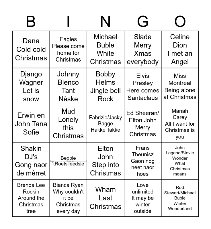This bingo card has 1 images, a free space and 24 words: Beppie 'tRoetsjleedsje, Bianca Ryan Why couldn't it be Christmas every day, Bobby Helms Jingle bell Rock, Brenda Lee Rockin Around the Christmas tree, Celine Dion I met an Angel, Dana Cold cold Christmas, Django Wagner Let is snow, Eagles Please come home for Christmas, Ed Sheeran/ Elton John Merry Christmas, Elton John Step into Christmas, Elvis Presley Here comes Santaclaus, Erwin en John Tana Sofie, Frans Theunisz Gaon nog neet naor hoes, John Legend/Stevie Wonder What Christmas means, Johnny Blenco Tant Nèske, Love unlimited It may be winter outside, Mariah Carey All I want for Christmas is you, Michael Buble White Christmas, Miss Montreal Being alone at Christmas, Mud Lonely this Christmas, Rod Stewart/Michael Buble Winter Wonderland, Shakin DJ's Gong naor de mèrret, Slade Merry Xmas everybody and Wham Last Christmas.