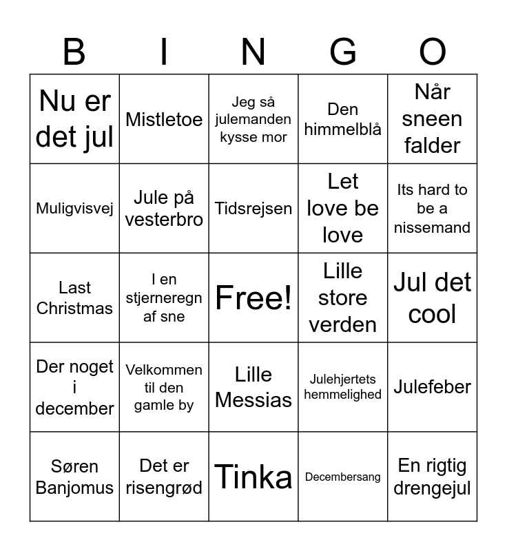 This bingo card has a free space and 25 words: Velkommen til den gamle by, Tinka, Tidsrejsen, Søren Banjomus, Når sneen falder, Nu er det jul, Muligvisvej, Mistletoe, Lille store verden, Lille Messias, Let love be love, Last Christmas, Julehjertets hemmelighed, Julefeber, Jule på vesterbro, Jul i Angora, Jul det cool, Jeg så julemanden kysse mor, Its hard to be a nissemand, I en stjerneregn af sne, En rigtig drengejul, Det er risengrød, Der noget i december, Den himmelblå and Decembersang.