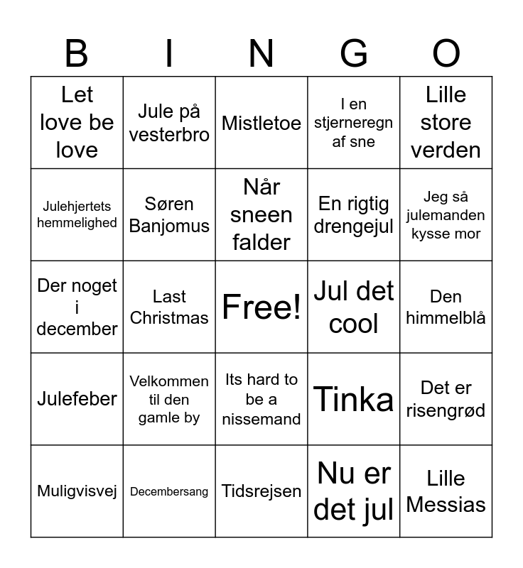 This bingo card has a free space and 25 words: Velkommen til den gamle by, Tidsrejsen, Når sneen falder, Muligvisvej, Lille store verden, Let love be love, Julehjertets hemmelighed, Jule på vesterbro, Jul det cool, Its hard to be a nissemand, En rigtig drengejul, Der noget i december, Tinka, Det er risengrød, Søren Banjomus, Jul i Angora, Den himmelblå, Mistletoe, Jeg så julemanden kysse mor, Last Christmas, Lille Messias, Decembersang, Julefeber, I en stjerneregn af sne and Nu er det jul.