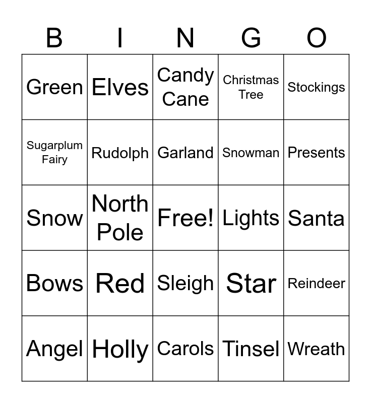 This bingo card has a free space and 24 words: Red, Holly, Garland, Angel, Stockings, Green, Sugarplum Fairy, Elves, Lights, Sleigh, Snowman, Snow, Star, Reindeer, Rudolph, Tinsel, Santa, Candy Cane, Presents, North Pole, Wreath, Bows, Christmas Tree and Carols.