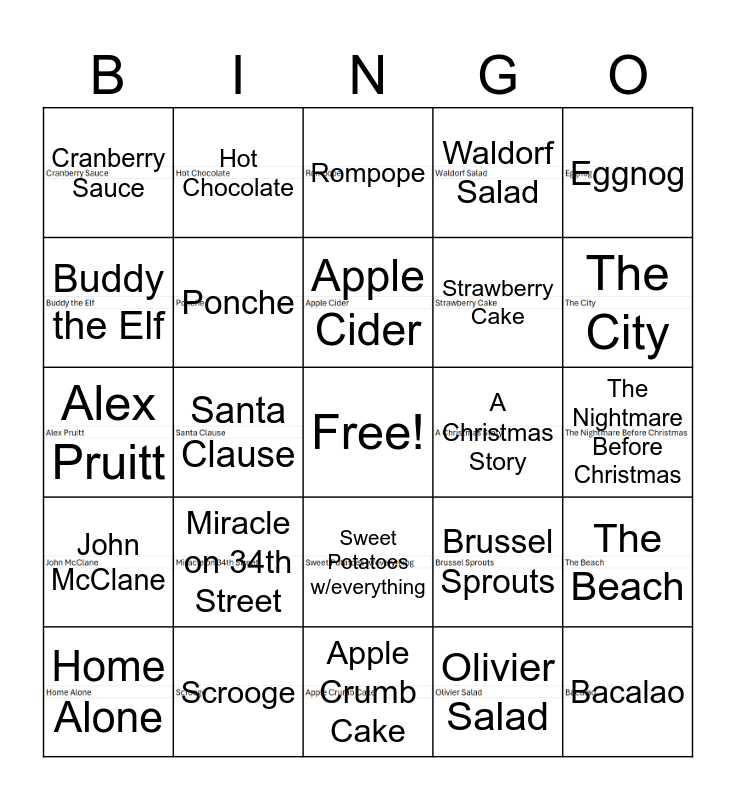 This bingo card has 24 images, a free space and 24 words: Miracle on 34th Street, Scrooge, Apple Cider, Home Alone, Eggnog, Cranberry Sauce, Buddy the Elf, Hot Chocolate, A Christmas Story, Sweet Potatoes w/everything, Strawberry Cake, Alex Pruitt, Brussel Sprouts, The Beach, Ponche, Olivier Salad, The Nightmare Before Christmas, Rompope, The City, Santa Clause, Bacalao, John McClane, Waldorf Salad and Apple Crumb Cake.