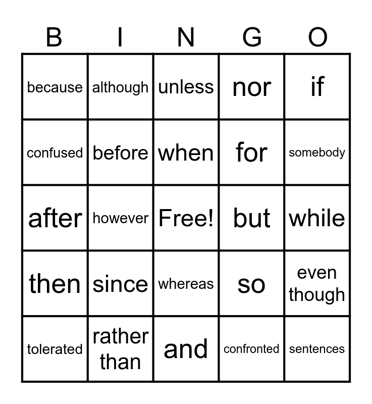 This bingo card has a free space and 24 words: tolerated, since, when, confronted, if, because, although, unless, but, while, after, before, so, even though, confused, rather than, and, nor, somebody, then, however, whereas, for and sentences.