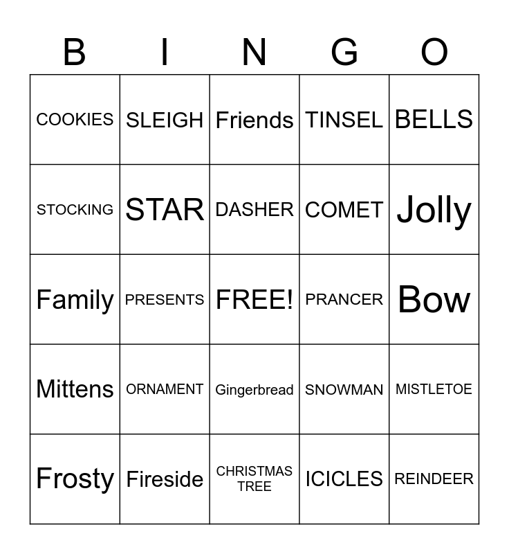 This bingo card has a free space and 49 words: SANTA CLAUS, REINDEER, RUDOLPH, CHRISTMAS TREE, ORNAMENT, TOYS, SLEIGH, CHIMNEY, STOCKING, ELF, STAR, TINSEL, MISTLETOE, SNOWMAN, CANDY CANE, DRUMMER BOY, DASHER, PRANCER, LIGHTS, BELLS, PRESENTS, ICICLES, COOKIES, COMET, Holly, Jolly, Frosty, Winter, Gingerbread, Mittens, Cocoa, Holiday, Scarf, North Pole, Fireside, Candy Cane, Greeting Cards, Wreath, Bow, Candles, Donner, Vixen, Giving, Love, Family, Friends, Snow, Music and MOVIES.