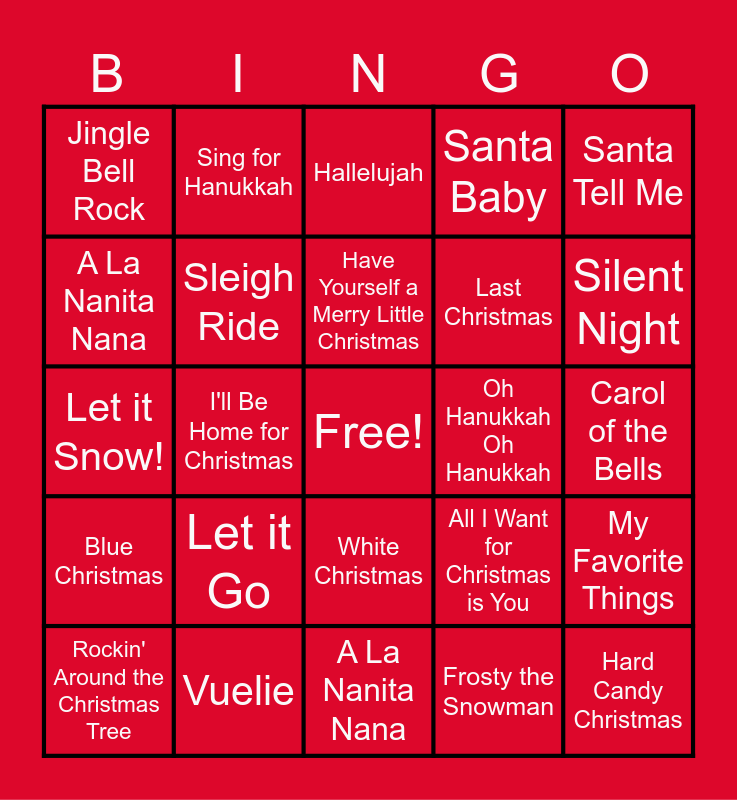 This bingo card has a free space and 24 words: Let it Go, Vuelie, Have Yourself a Merry Little Christmas, Rockin' Around the Christmas Tree, Santa Tell Me, Jingle Bell Rock, A La Nanita Nana, Sing for Hanukkah, Oh Hanukkah Oh Hanukkah, White Christmas, Last Christmas, Let it Snow!, All I Want for Christmas is You, My Favorite Things, Sleigh Ride, Frosty the Snowman, Carol of the Bells, Hallelujah, Silent Night, I'll Be Home for Christmas, Hard Candy Christmas, Blue Christmas, Santa Baby and A La Nanita Nana.