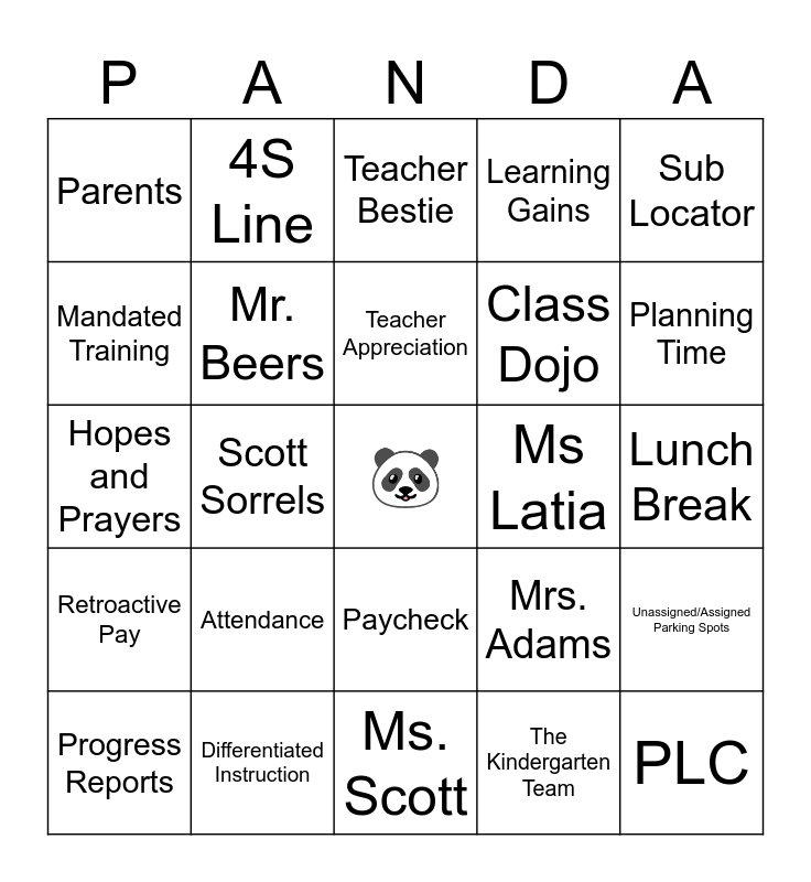 This bingo card has a free space and 31 words: Ms. Scott, Mrs. Nobles, Scott Sorrels, Students, Parents, Teacher Bestie, Mr. Beers, Mrs. Adams, Ms Latia, The Kindergarten Team, Lunch Break, PLC, Field Trips, Bathroom Breaks, Planning Time, Panda, Unassigned/Assigned Parking Spots, Attendance, Retroactive Pay, Paycheck, Sub Locator, Centigex Badge, Progress Reports, 4S Line, Class Dojo, Mandated Training, Learning Gains, Hopes and Prayers, Differentiated Instruction, Teacher Appreciation and Ride the Wave of Customer service.