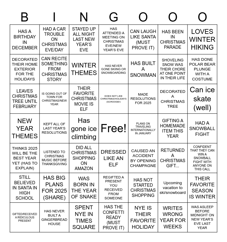 This bingo card has a free space and 63 words: CHRISTMAS/HOLIDAY THEMES, HAD A SNOWBALL FIGHT, HAS A SAD MEMORY WITH MISTLETOE, DECORATED A CHRISTMAS TREE, DID ALL CHRISTMAS SHOPPING ON AMAZON, GIFTED/RECEIVED A RIDICULOUS PRESENT, HAD A CAR TROUBLE ON CHRISTMAS EVE/DAY, CAN NAME ALL 9 REINDEERS (NO CHEATING!), DECORATED THEIR HOME EXTERIOR FOR THE HOLIDAYS, HAS NEVER BUILT A GINGERBREAD HOUSE, DOES NOT LIKE CHRISTMAS/HOLIDAYS (SCROOGE!), HAS NOT STARTED CHRISTMAS SHOPPING, LEAVES CHRISTMAS TREE UNTIL FEBRUARY, CAN LAUGH LIKE SANTA (MUST PROVE IT), IS WEARING FESTIVE SOCKS NOW (NO CHEATING!), HAS BEEN IN CHRISTMAS PARADE, HAS BUILT A SNOWMAN, HAS A BIRTHDAY IN DECEMBER, HAS STAYED AWAKE ALL NIGHT ON CHRISTMAS EVE, CAN RECITE SOMETHING FROM CHRISTMAS STORY, THEIR FAVORITE CHRISTMAS MOVIE IS ELF, IS GOING OUT OF TOWN FOR CHRISTMAS/NEW YEAR, HAS ATTENDED A MEETING ON CHRISTMAS EVE/NEW YEAR’S EVE, LISTENED TO CHRISTMAS MUSIC BEFORE THANKSGIVING, BROUGHT OUT CHRISTMAS TREE ON 11/01, RETURNED A CHRISTMAS GIFT..., DRESSED LIKE AN ELF, HATES EGGNOG, GIFTING A HOMEMADE ITEM THIS YEAR, STILL BELIEVED IN SANTA IN HIGH SCHOOL, SENDS CHRISTMAS CARDS, REGIFTED A PRESENT YOU RECEIVED FROM SOMEONE, ALREADY PUT YOUR ‘OUT OF OFFICE’ ON OUTLOOK, HAS GONE CHRISTMAS CAROLING, WINTER THEMES, Can ice skate (well), Upcoming vacation to ski/snowboard, Has gone ice climbing, CONFIDENT THAT THEY CAN WIN A SNOWBALL FIGHT WITH ANYONE ON THIS CALL, LOVES WINTER HIKING, HAS NEVER GONE SKIING OR SNOWBOARDING, HAS DONE POLAR BEAR PLUNGE WITH A COSTUME, THEIR FAVORITE SEASON IS WINTER, LOVES WINTER CLOTHES, SHOVELING SNOW WAS THEIR CHORE AT ONE POINT IN THEIR LIFE, NEW YEAR THEMES, WAS ASLEEP BEFORE MIDNIGHT ON NEW YEAR’S EVE LAST YEAR, MADE RESOLUTIONS FOR 2025, SPENT NYE IN TIMES SQUARE, NYE IS THEIR FAVORITE HOLIDAY, WRITES WRONG YEAR FOR WEEKS, KEPT ALL OF LAST YEAR’S RESOLUTIONS, THINKS 2025 WILL BE THE BEST YEAR YET (HAS TO EXPLAIN), ACHIEVED A LIFE GOAL THIS PAST YEAR, HAS PLANS TO GO OUT ON NYE, STAYED UP ALL NIGHT LAST NEW YEAR’S EVE, WAS BORN IN THE YEAR OF SNAKE, CAUSED AN ACCIDENT BY OPENING CHAMPAGNE, HAS BIG PLANS FOR 2025 (SHARE), HAS THE CONFETTI READY (MUST PROVE IT), HAS A BIRTHDAY IN JANUARY, PLANS ON TRAVELING INTERNATIONALLY IN JANUARY and HAS STARTED DEEP CLEANING FOR THE NEW YEAR.