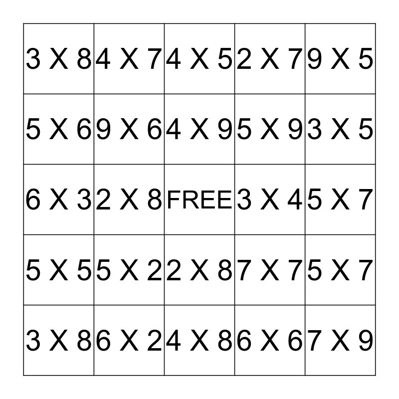 This bingo card has a free space and 24 words: 5 X 2, 6 X 2, 4 X 9, 3 X 8, 9 X 5, 3 X 8, 5 X 6, 4 X 7, 3 X 4, 2 X 8, 5 X 9, 6 X 3, 7 X 7, 5 X 7, 9 X 6, 6 X 6, 5 X 7, 4 X 5, 3 X 5, 2 X 8, 7 X 9, 5 X 5, 2 X 7 and 4 X 8.