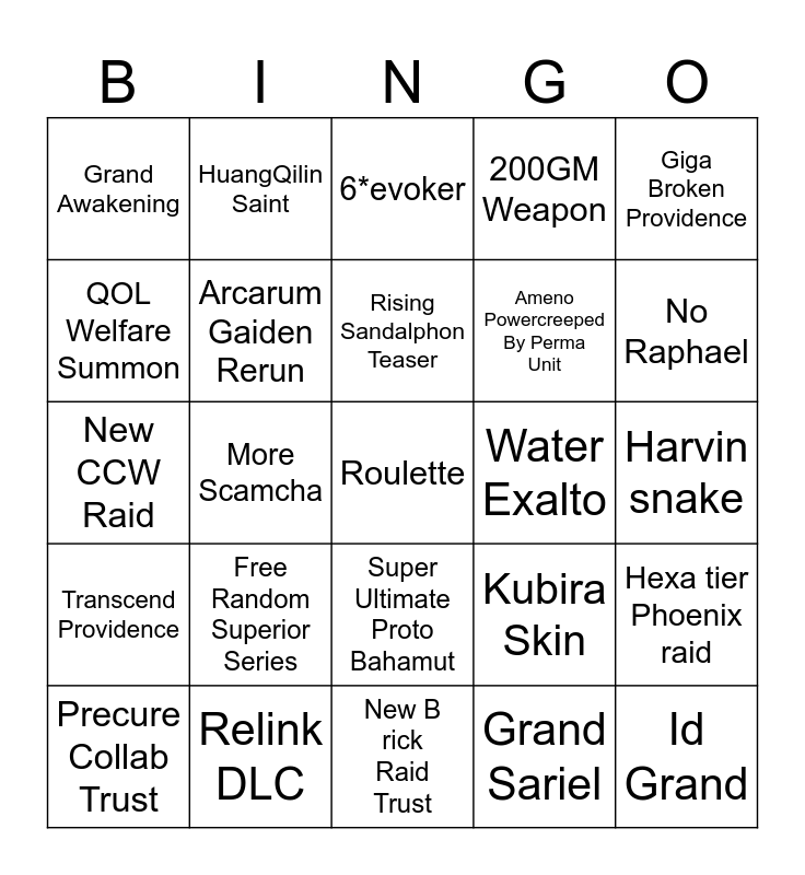 This bingo card has a free space and 24 words: Free Random Superior Series, Relink DLC, Rising Sandalphon Teaser, Precure Collab Trust, Giga Broken Providence, Grand Awakening, QOL Welfare Summon, HuangQilin Saint, Water Exalto, Super Ultimate Proto Bahamut, Ameno Powercreeped By Perma Unit, New CCW Raid, Kubira Skin, Hexa tier Phoenix raid, Arcarum Gaiden Rerun, Grand Sariel, Harvin snake, 6*evoker, No Raphael, More Scamcha, Id Grand, Transcend Providence, 200GM Weapon and New Brick Raid Trust.