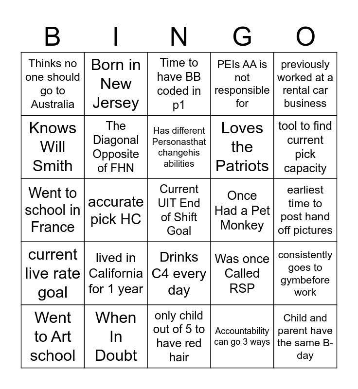 This bingo card has 25 words: lived in California for 1 year, only child out of 5 to have red hair, Has different Personasthat changehis abilities, Went to Art school, previously worked at a rental car business, Thinks no one should go to Australia, Knows Will Smith, Born in New Jersey, Once Had a Pet Monkey, Drinks C4 every day, Loves the Patriots, Went to school in France, Was once Called RSP, consistently goes to gymbefore work, The Diagonal Opposite of FHN, Child and parent have the same B-day, earliest time to post hand off pictures, Time to have BB coded in p1, tool to find current pick capacity, accurate pick HC, Current UIT End of Shift Goal, When In Doubt, current live rate goal, PEIs AA is not responsible for and Accountability can go 3 ways.