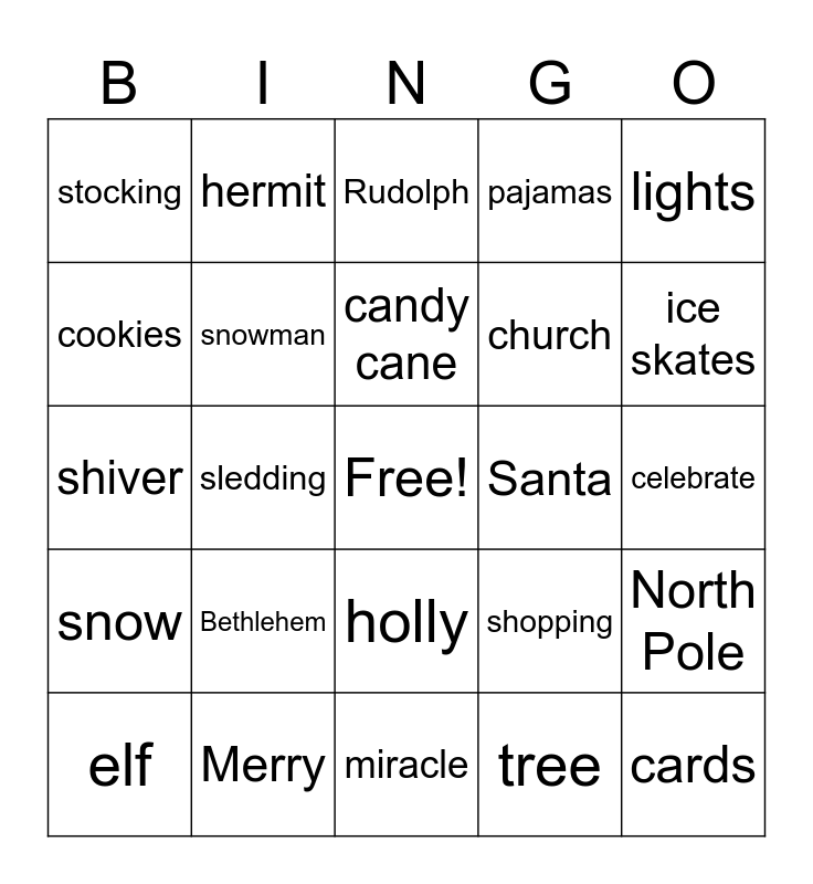 This bingo card has a free space and 60 words: Christmas, Merry, Jesus, snow, tree, ornaments, snowman, jingle bells, church, star, pajamas, coffee, cookies, December, wreath, stocking, cards, lights, candle, candy cane, Santa, Rudolph, elf, North Pole, nutcracker, mistletoe, gingerbread man, hot cocoa, ice skates, walleye, snowflake, boots, cold, blizzard, hermit, frozen, joyful, sledding, shovel, shiver, Advent, Bethlehem, celebrate, chimney, shopping, Starbucks, family, eggnog, jolly, holly, miracle, New Year, Noel, party, pine tree, poinsettia, ribbon, Scrooge, tinsel and toys.